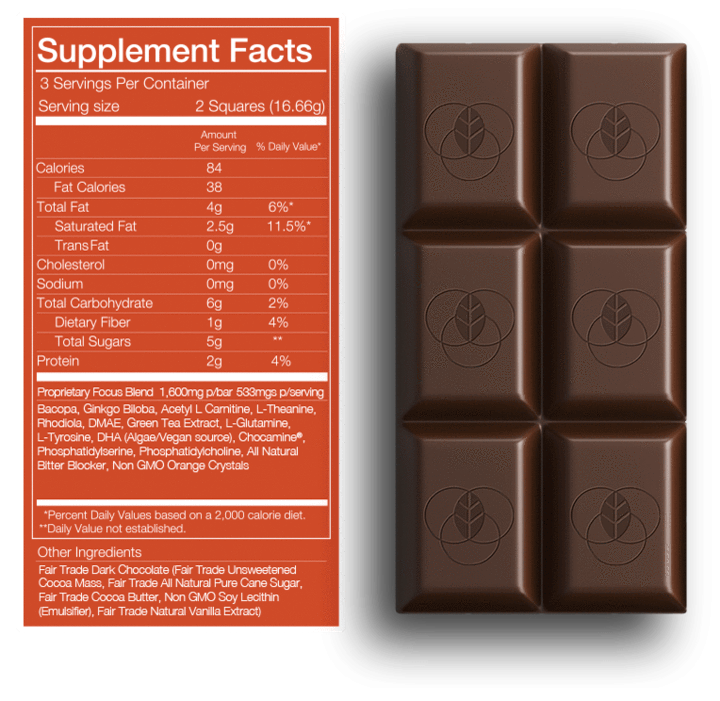 The Brainy bar uses Ginkgo Biloba, Bacopa, Rhodiola, as well a blend of amino acids, Omega 3 fatty acids, and Chocamine®, a patented cocoa-based ingredient that may help improve cognitive function.’This bar also contains Green Tea Extract to boost focus and provide antioxidants.*It also has Orange for a boost of flavonoids.*Also the DHA and Omega 3 fatty acids mentioned before are derived from algae.