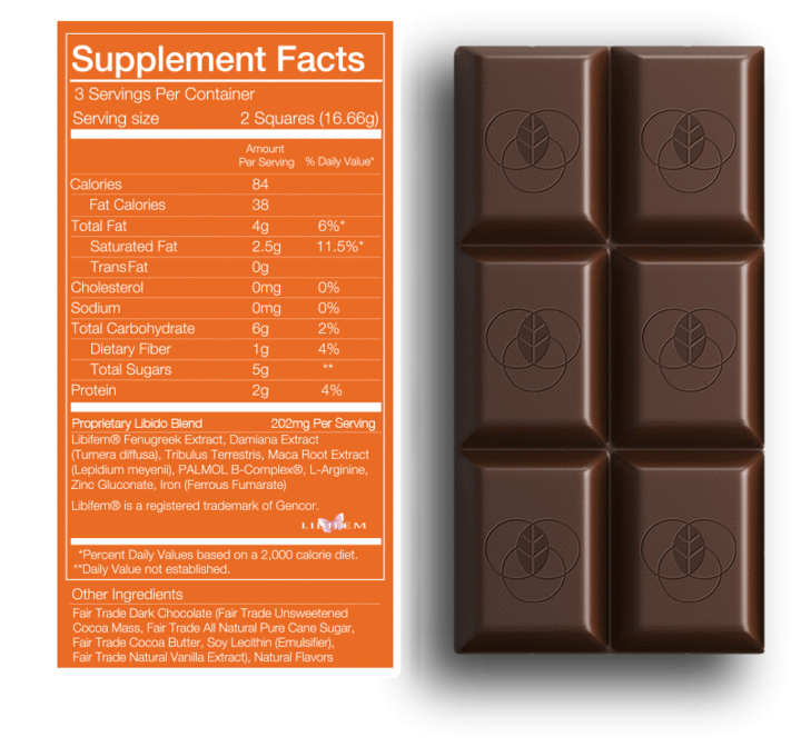 Functional Chocolate Sexy Bar releases inhibition and unleashes sensuality with a blend of botanicals, vitamins, and patented LibiFem®( a Fenugreek extract), clinically shown to help promote feelings of intimacy and healthy female desire.
